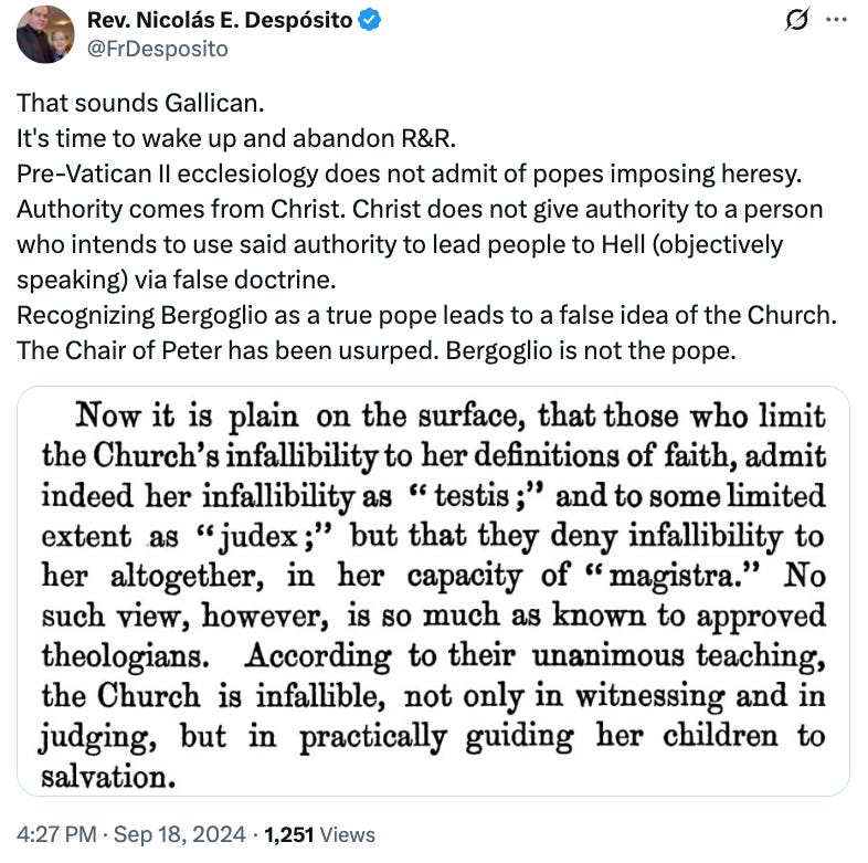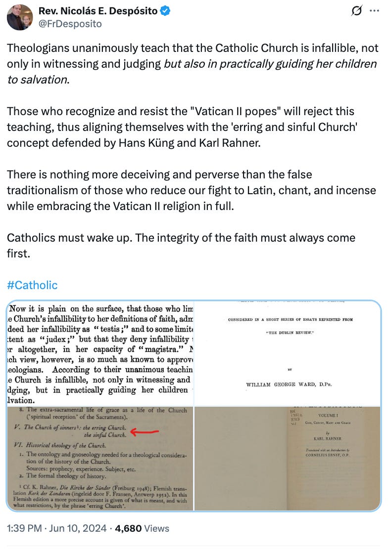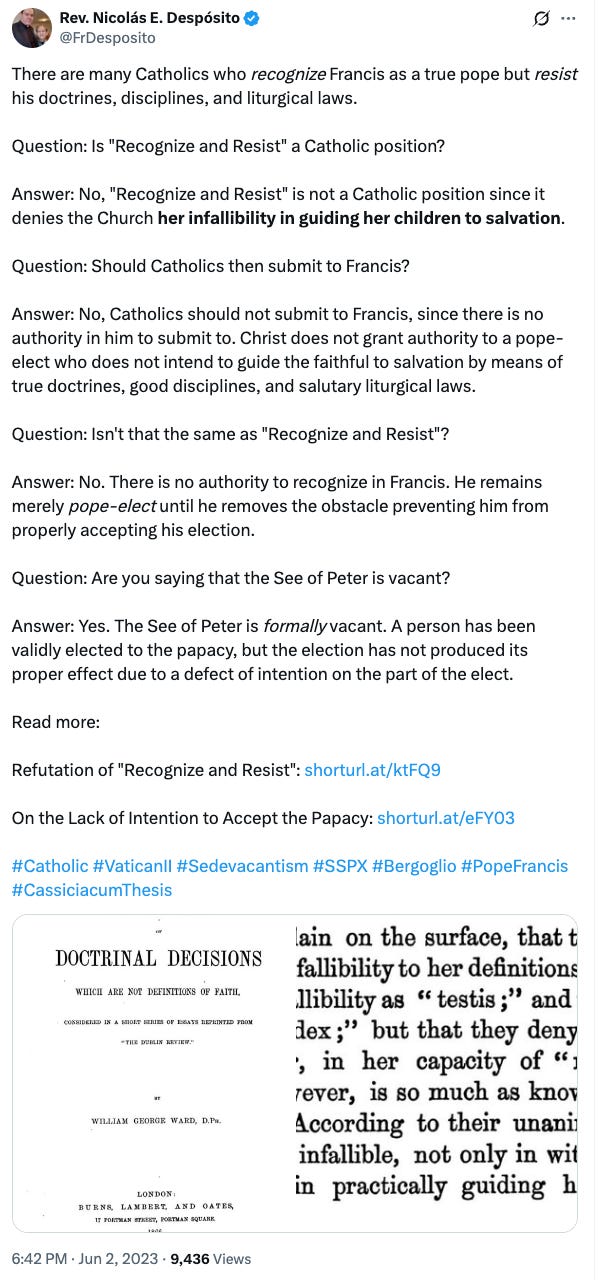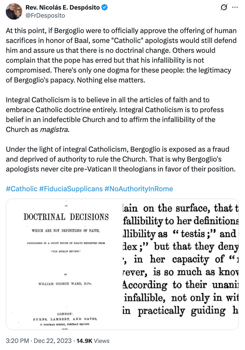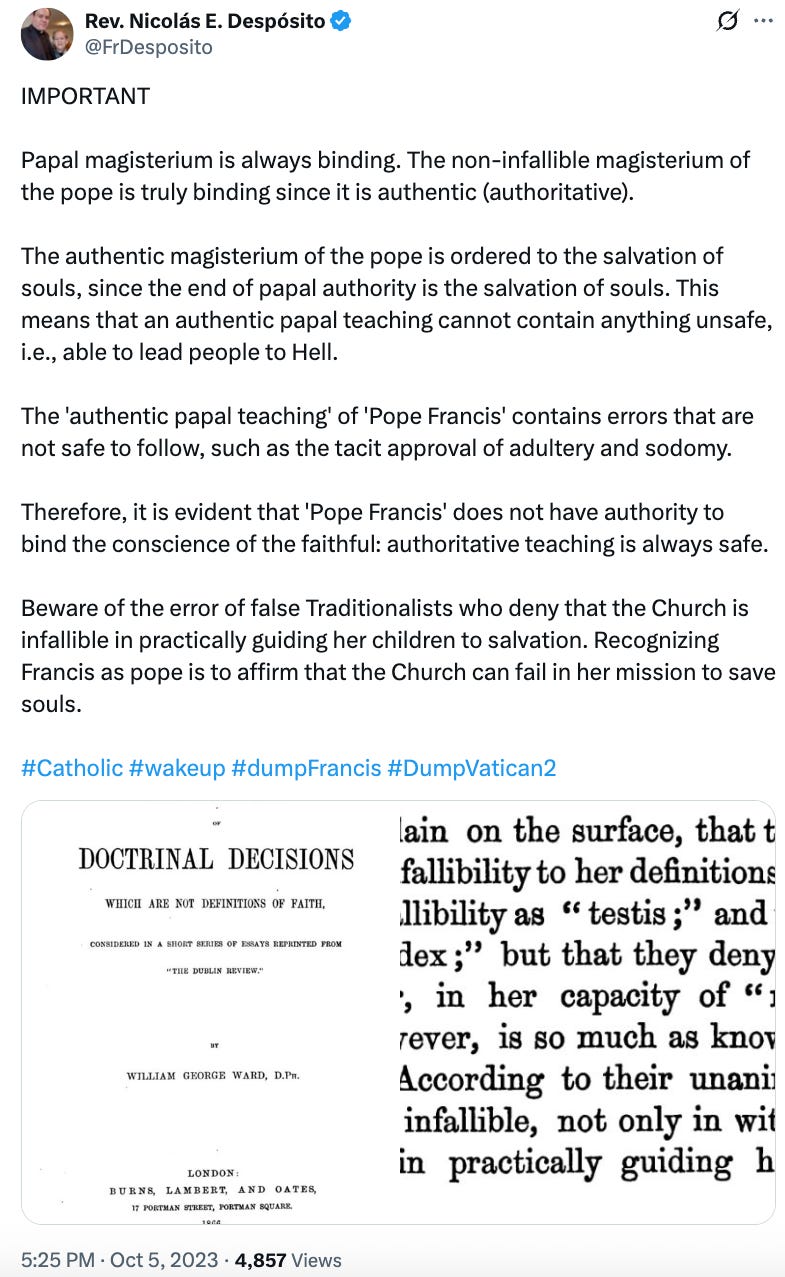 It is, however, notable Fr Nicolás Despósito of Bishop Sanborn’s RCI has cited and even promoted Ward’s work The Authority of Doctrinal Decisions which are not Definitions of Faith on several occasions: