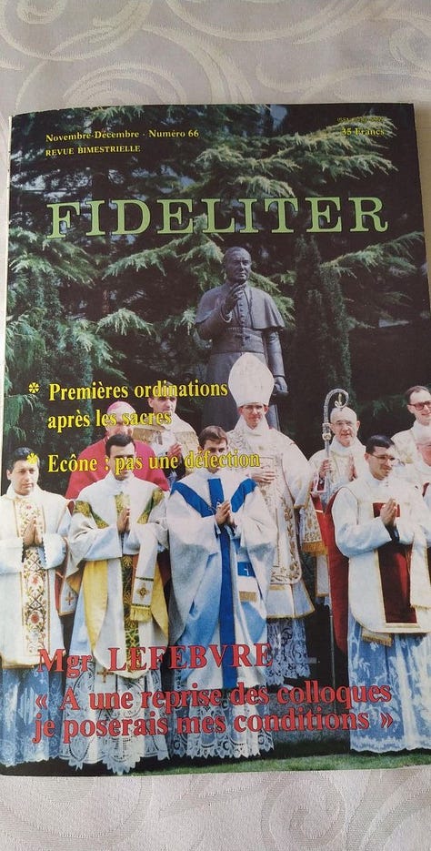 L’apostolicité ? Ils ont rompu avec le passé. S’ils ont fait quelque chose, c’est bien cela. Ils ne veulent plus de ce qui s’est passé avant le concile Vatican II. Voyez le motu proprio du pape nous condamnant, il dit bien : « la Tradition vivante, c’est Vatican II ». Il ne faut pas se reporter avant Vatican II, cela ne signifie rien. L’Église porte la Tradition avec elle de siècle en siècle. Ce qui est passé est passé, disparu. Toute la Tradition se trouve dans l’Église d’aujourd’hui. Quelle est cette Tradition ? A quoi se rattache-t-elle ? Comment se rattache-t-elle au passé ?