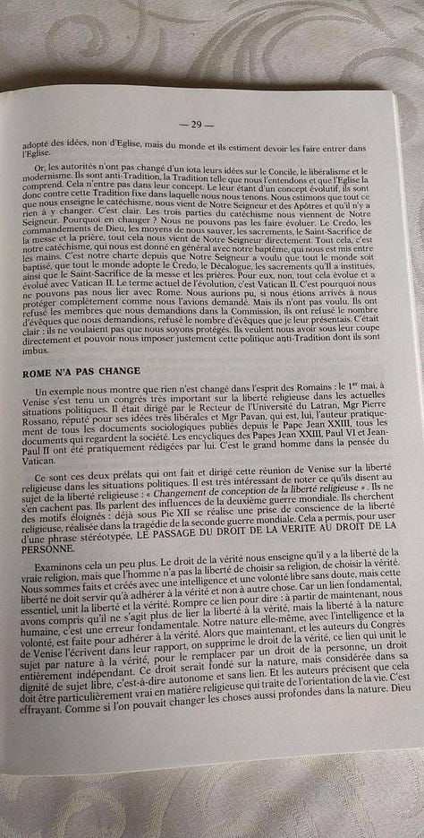 Un exemple nous montre que rien n’est changé dans l’esprit des Romains : le 1er mai, à Venise s’est tenu un congrès très important sur la liberté religieuse dans les actuelles situations politiques. Il était dirigé par le Recteur de l’Université du Latran, Mgr Pierre Rossano, réputé pour ses idées très libérales et Mgr Pavan, qui est, lui, l’auteur pratiquement de tous les documents sociologiques publiés depuis le Pape Jean XXIII, tous les documents qui regardent la société. Les encycliques des Papes Jean XXIII, Paul VI et Jean-Paul II ont été pratiquement rédigées par lui. C’est le grand homme dans la pensée du Vatican.