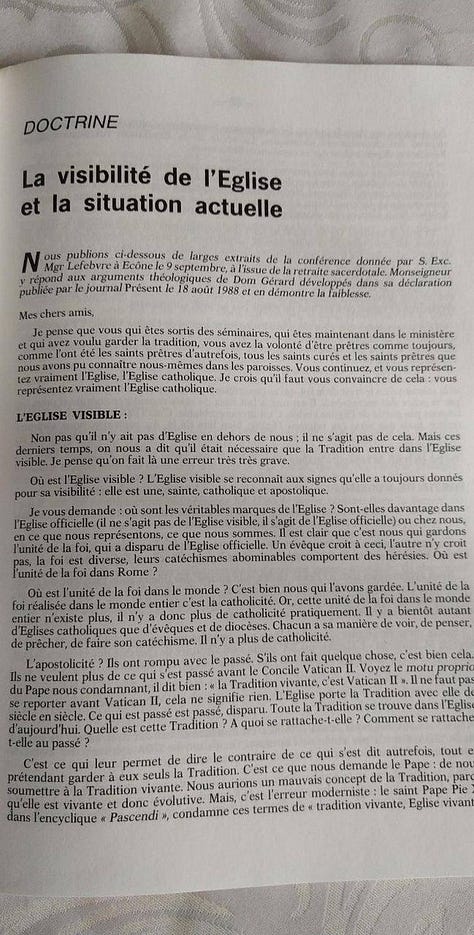 Non pas qu’il n’y ait pas d’Eglise en dehors de nous; il ne s’agit pas de cela. Mais ces derniers temps, on nous a dit qu’il était nécessaire que la Tradition entre dans l’Eglise visible. Je pense qu’on fait là une erreur très, très grave. Où est l’Eglise visible ? L’Eglise visible se reconnaît aux signes qu’elle a toujours donnés pour sa visibilité : elle est une, sainte, catholique et apostolique.