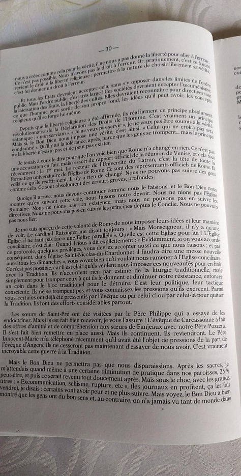 Tout cela montre que c’est nous qui avons les marques de l’Eglise visible. S’il y a encore une visibilité de l’Eglise aujourd’hui, c’est grâce à vous. Ces signes ne se trouvent plus chez les autres. Il n’y a plus chez eux l’unité de la foi, or c’est la foi qui est la base de toute visibilité de l’Eglise.
