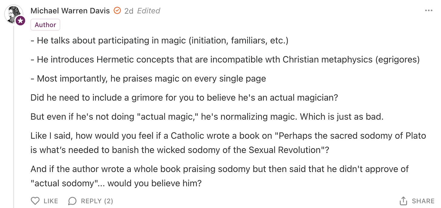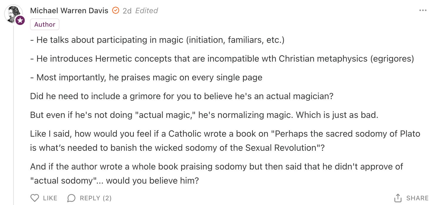 Davis himself has released a second part to his review, aimed at Eastern Orthodox readers, and which contains a number of tropes about the defects of Catholic scholasticism and philosophy. While it does not add much to the first part, he provides what he calls an “odd passage” from the book—originally published in The European Conservative as part of Morello’s trilogy ‘Can Hermetic Magic Rescue the Church?’