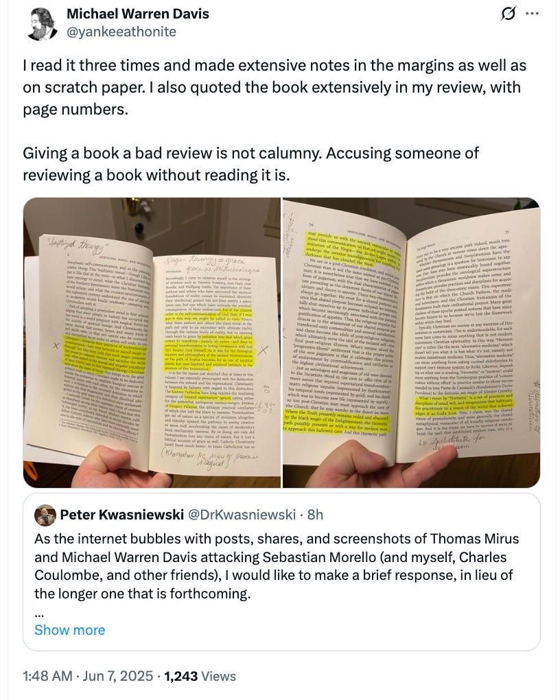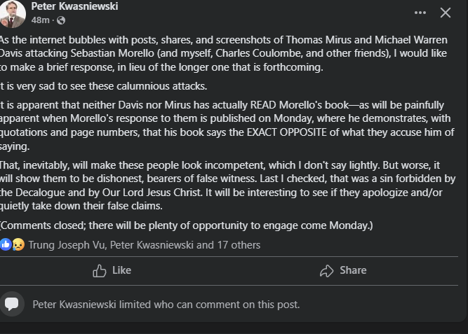 Kwasniewski followed this with a longer post, calling Davis and Mirus’ critiques “calumnious attacks.”