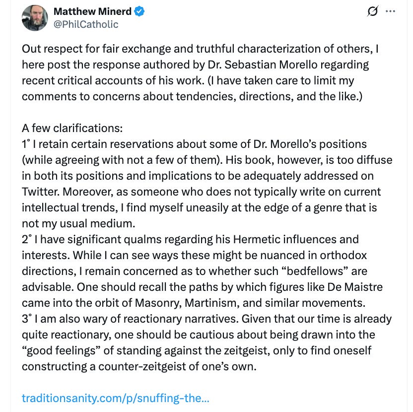 has published ’s reply to Michael Warren Davis () and Thomas V. Mirus. As promised, here is Morello’s reply.Morello’s reply was interesting in many ways. I shall not be responding to it for now. In the meantime, I appreciated Dr Minerd’s comment on Twitter and broadly agree with what he said.