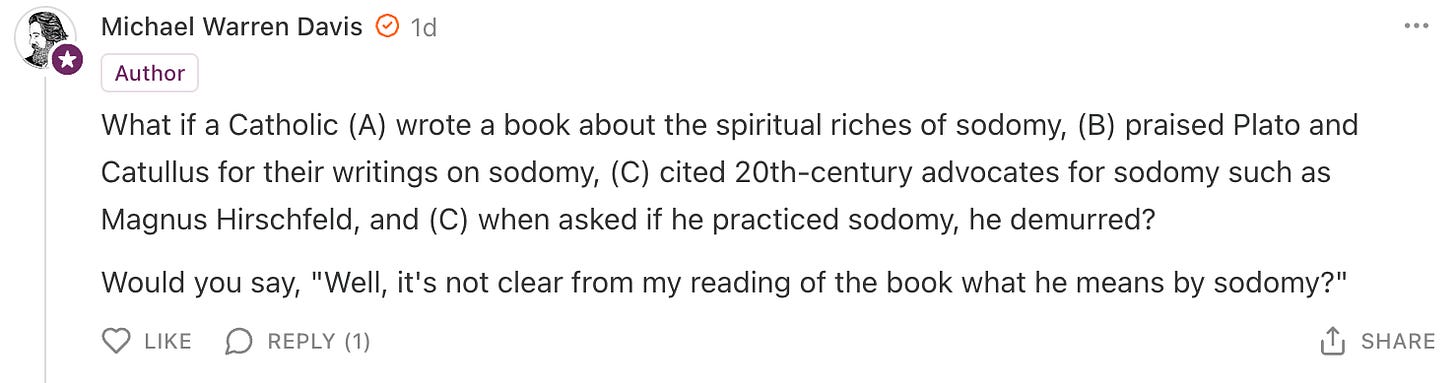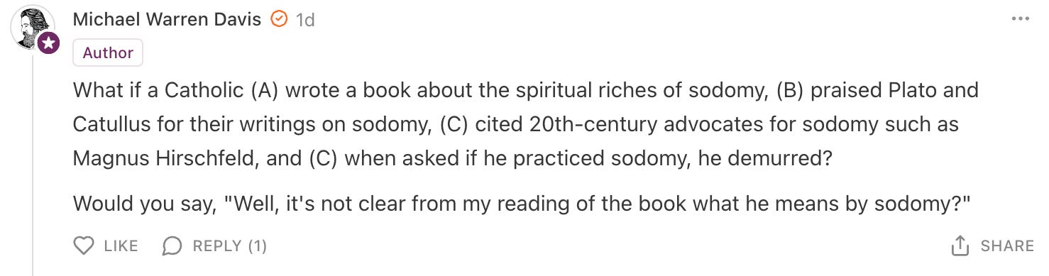 What if a Catholic (A) wrote a book about the spiritual riches of sodomy, (B) praised Plato and Catullus for their writings on sodomy, (C) cited 20th-century advocates for sodomy such as Magnus Hirschfeld, and (C) when asked if he practiced sodomy, he demurred?