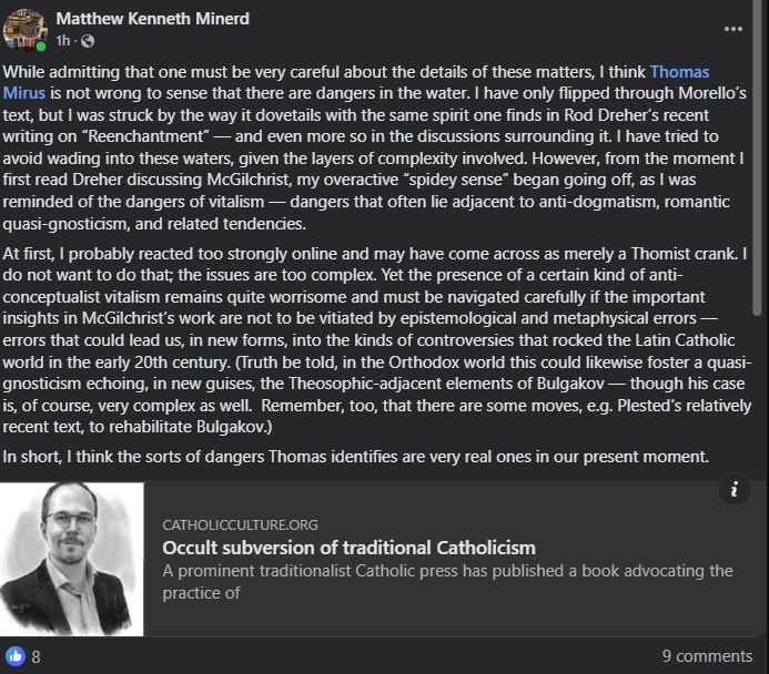 [A]t the time of its publication in 2021 I followed up on much of the author’s research and found it generally accurate. It is still essential reading for those who wish to be aware of the influence of occultism and false mysticism within a certain scene of traditionalist or conservative Catholic intellectuals.
