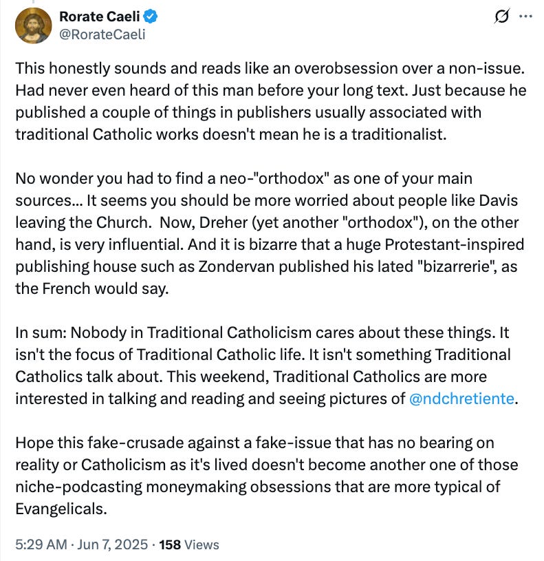 Rorate Caeli dismissed the issue, claiming that he had “never even heard of [Morello]” before Mirus's post, and disclaiming his “status” as a traditionalist—despite the lauding of his book by the network, and Morello’s name appearing on a dozen articles on his own website.