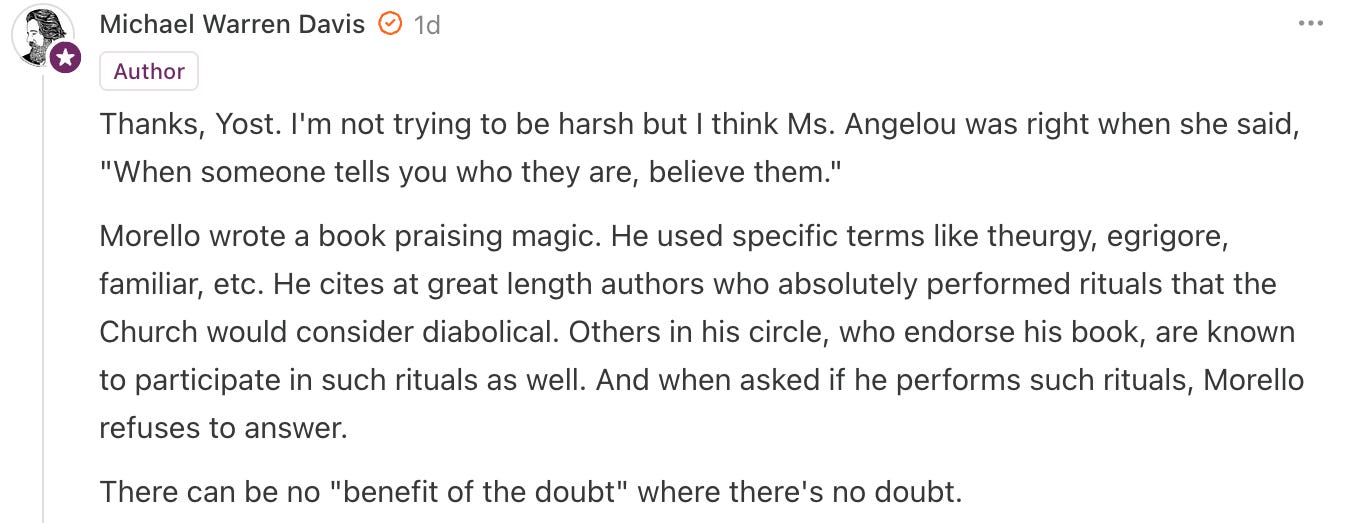 Morello wrote a book praising magic. He used specific terms like theurgy, egrigore, familiar, etc. He cites at great length authors who absolutely performed rituals that the Church would consider diabolical. Others in his circle, who endorse his book, are known to participate in such rituals as well. And when asked if he performs such rituals, Morello refuses to answer.