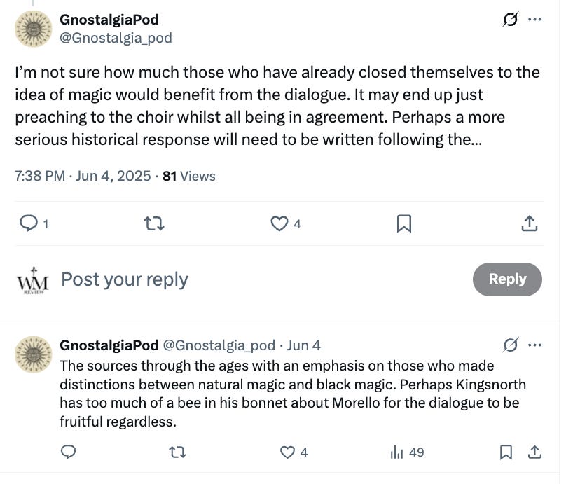 The caricature of sedevacantists uncharitably accusing others of being “crypto-occultists” runs rather hollow. After all, The Gnostalgia Podcast’s twitter account has responded to calls for dialogue over the current controversy by dismissing those “who have already closed themselves to the idea of magic”!