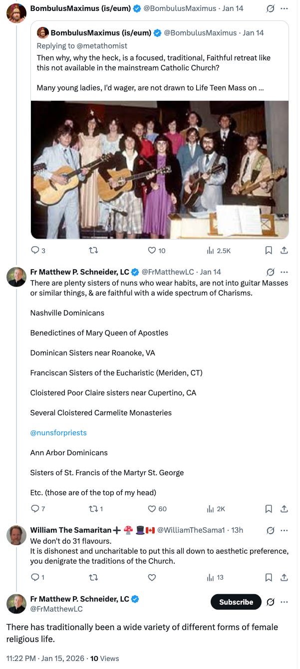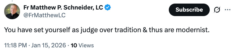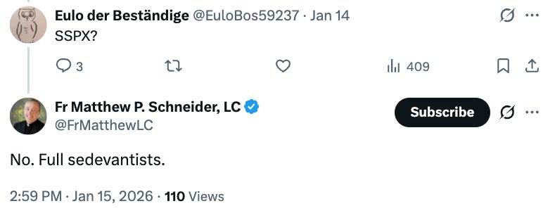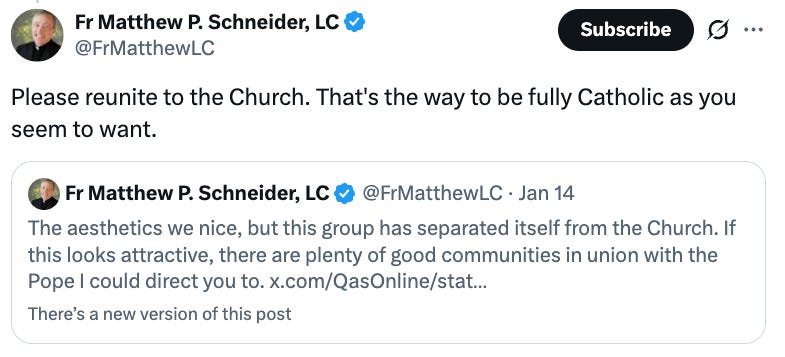 The Conciliar/Synodal Church has beautiful ceremonies and sermons in its “big tent” and “broad Church” – but not so many young and thriving traditional religious orders. Yes, groups like this do exist – and Fr Schneider provided links to some. But the reality is that such orders, wherever they are found, hold a powerful attraction. These clergymen know it, and so they have to warn the world against them when they see them outside the Conciliar/Synodal hellscape.