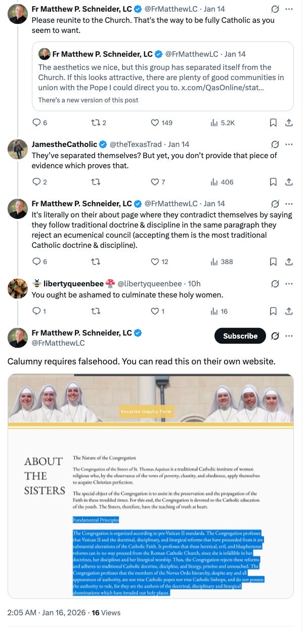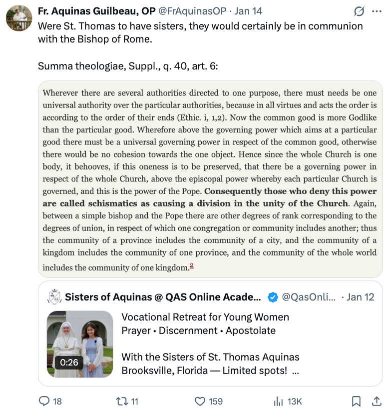 Fr Aquinas directly insinuates, in a rather catty way, that the Sisters of St Thomas Aquinas are not “in communion with the Bishop of Rome.” According to Catholic ecclesiology – though not Conciliar/Synodal ecclesiology – this would mean that they are not Catholic. To prove his point, he provides a text from St Thomas about those who deny the power of the Roman Pontiff.