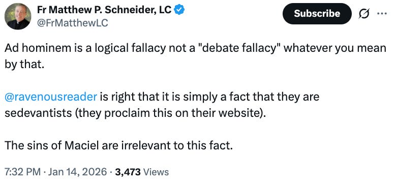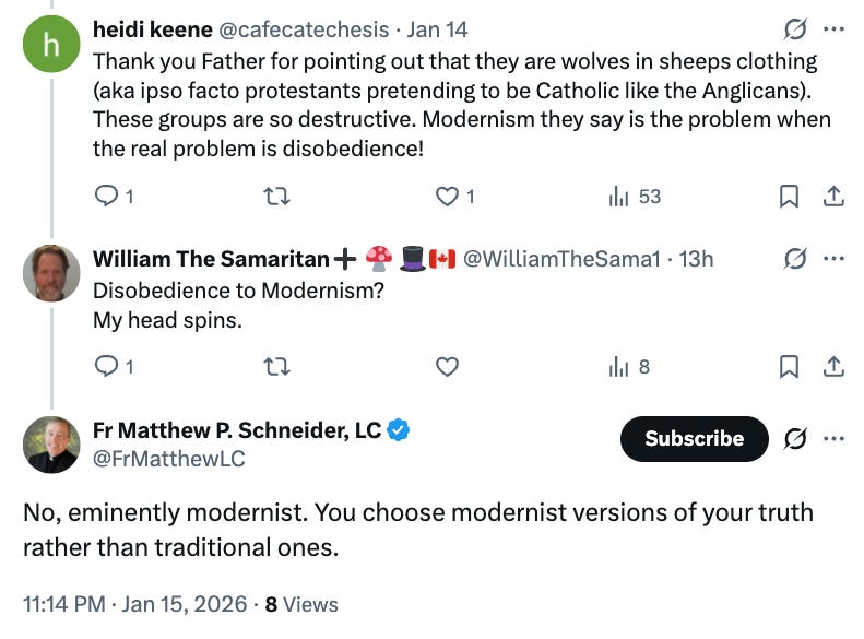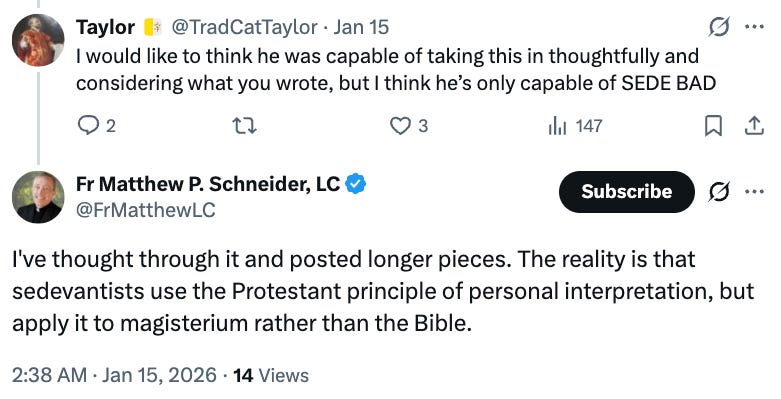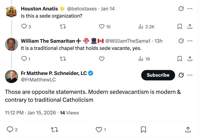 The weaponized orthodoxy frameworkis really useful here. That point about Fr Schneider accepting guitar masses while condemning the Sisters cuts to the core inconsistency. If the Conciliar church really operates as a big tent with room for wildly divergent practices, then applying rigid categoris to traditional groups becomes obviously selective. The citations from Wernz, Vidal, and Cajetan about doubtful elections not constituting schism are particularly strong - those aren't fringe sources. I hadnt thought about how the same Vatican II ecumenical language that extends to Protestants would logically apply even more to sedevacantists