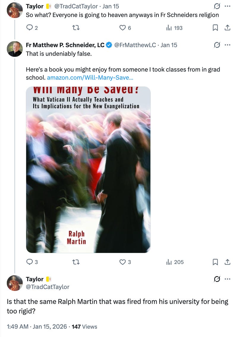Schneider responded extensively to those who engaged with his comments. For example, recommending conservative religious orders in the Conciliar/Synodal milieu.