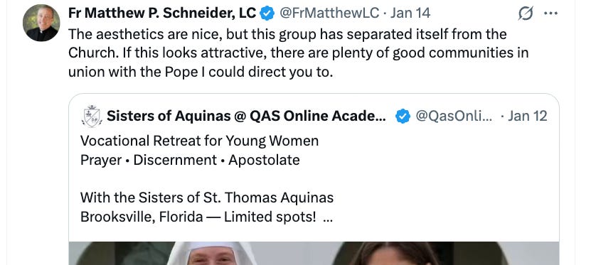 Fr Aquinas Guilbeau OP is a Dominican Friar of the Province of St Joseph, USA. His X biography informs us that he is also the chaplain and vice president of Catholic University of America, and an instructor at the Pontifical Faculty at Dominican House of Studies. Fr Aquinas’ account on X appears to be dignified and serious (unlike some of his fellow Novus Ordo Dominicans on the platform), making the potshot taken at the Sisters appear somewhat out of character.